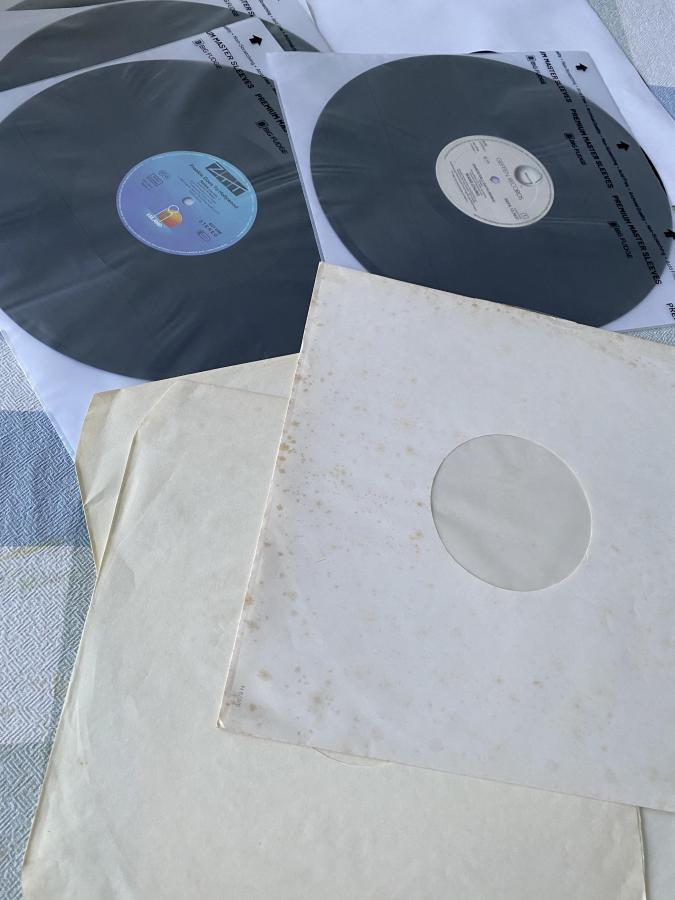 Und was sich immer lohnt: Austausch der Innenhüllen (nach der Reinigung der Platte) bzw. bei Scheiben ohne Innenhülle sowieso eine (erste) Hülle.... Auf einem Foto sieht man auch die "alten" Innenhüllen (soweit vorhanden) und die neuen gefütterten Innenhüllen. Ich denke das Foto spricht für sich.