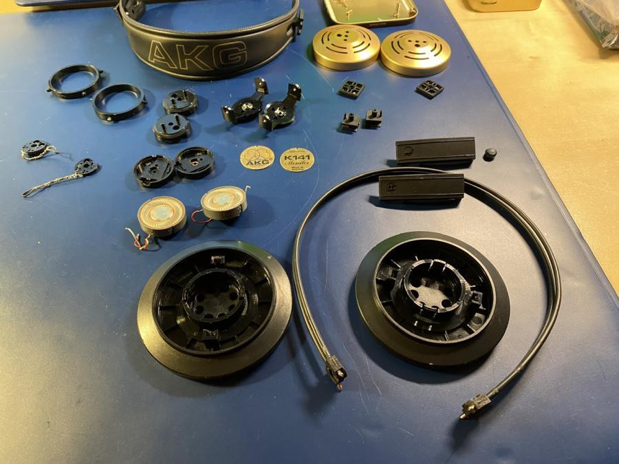 Ich habe den AKG K141 Monitor komplett zerlegt, gesäubert und heute wieder montiert. Es fehlen noch die neuen Ohrpolster, die aber im Zulauf sind. Hier ein Bild der Einzelteile ohne Kabel und Polster: