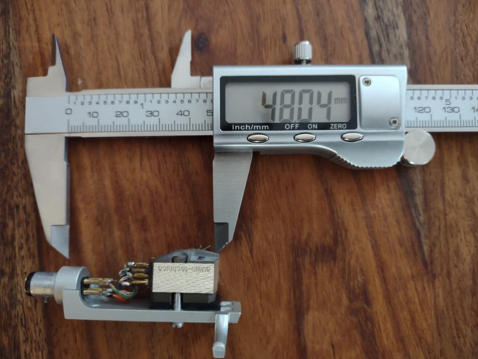 Die 48mm sind korrekt. Dieser Tonabnehmer wurde auf dem KD-750 mit Kenwood Überhanglehre auf 15mm Überhang justiert. An der anderen Seite (extra für Rolf mit Schieblehre) ergeben sich 48mm. Und bevor jetzt der Nächste meckert weil das ganze gar nicht bündig liegt, das kommt davon, wenn man das Handy nicht gerade hält.