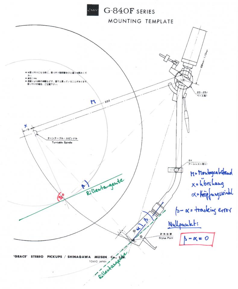 Den Abstand, den Du in der Bedienungsanleitung gefunden hast ist ein Einbaumaß. Wenn Du das für die genormte SME Headshell hast, dann wird die Montage und Justage des Tonabnehmers ganz einfach. Dann benötist Du nämlich keine Schablone mehr sondern richtest den Tonabenhmer nur noch gerade in der Headshell aus und achtest auf dieses Einbaumaß - also Abstand zwischen dem Bajonettkragen und der Nadelspitze.