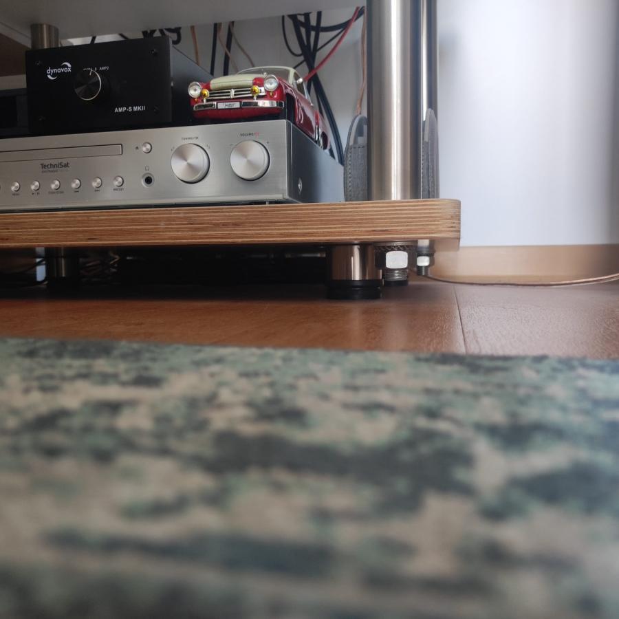 Meine Inspiration war - nachdem ich meinen gerade neu erworbenen Technics SL-PS 840 mit speziellen Gerätefüßen gepimpt hatte (die Bezeichnung habe ich gerade nicht mehr korrekt auf dem Schirm - irgendwas mit SACD oder so ähnlich - jedenfalls ging es darum, dass das zentrale Element dieser Füße, welches das Gerät trägt, an Bändern aufgehängt in seiner "Hülle" ruht und somit wie auch immer geartete Schwingungen aus der Unterlage des entsprechenden Gerätes durch diese Entkoppelung die klangbeeinflussenden  Schwingungen nicht an das Gerät weitergibt.