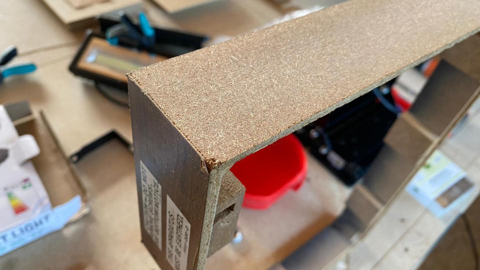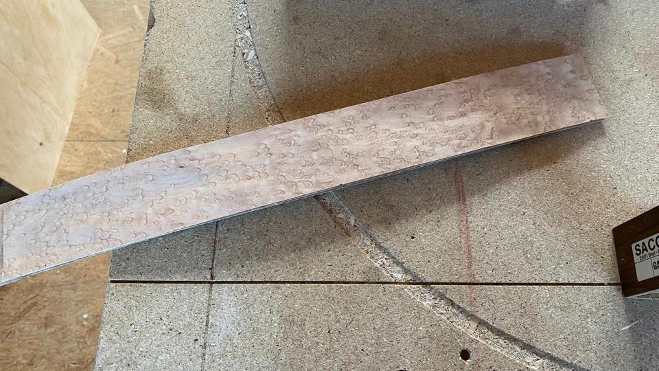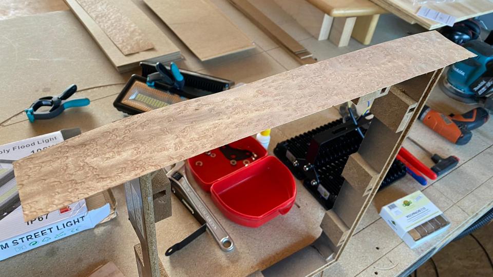Dann geht es weiter mit grob zurecht schneiden und aufleimen. Die Sichtkanten werden als erstes gemacht. Bei so dünnem Furnier von 0,6 mm ist das kein Problem, aber bei über einem mm sieht man die Seite. Man kann es ja nicht auf Gehrung sägen...